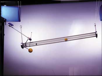 Balance XDieses Objekt (rechts im Bild) wurde auf Anregung eines Zahnarztes entwickelt, der sich ein Objekt für seine Praxis gewünscht hatte. Es entstand dann "Balance X", das fast geräuschlos, angetrieben durch einen Präzisionsmotor, einen Ball in Bewegung setzt. Er soll durch seine unvorhersehbaren Bewegungsmuster die Patienten während der Behandlung von ihrem "schrecklichen, unabwendbaren Schicksal" ablenken. |